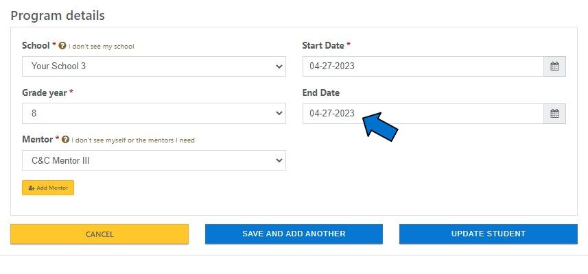 Scroll to the bottom of the page to locate the Program details section that lists the End Date (the date a student exited the C&C intervention if applicable).